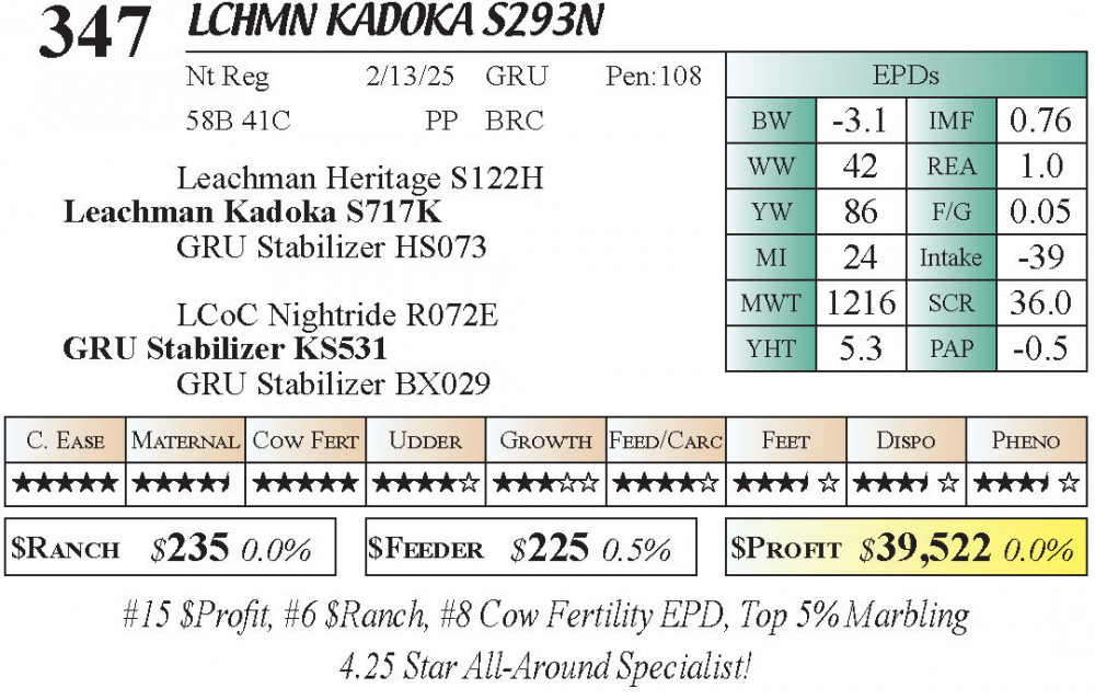 LCHMN Kadoka S293N (#347) 3.23.26 Leachman Cattle Spring Bull Sale 10:00 AM MTN 4 & 5 Star Calving Ease Bulls Bull - Stabilizer Top 100 $Profit Top 75 $Ranch Bulls
