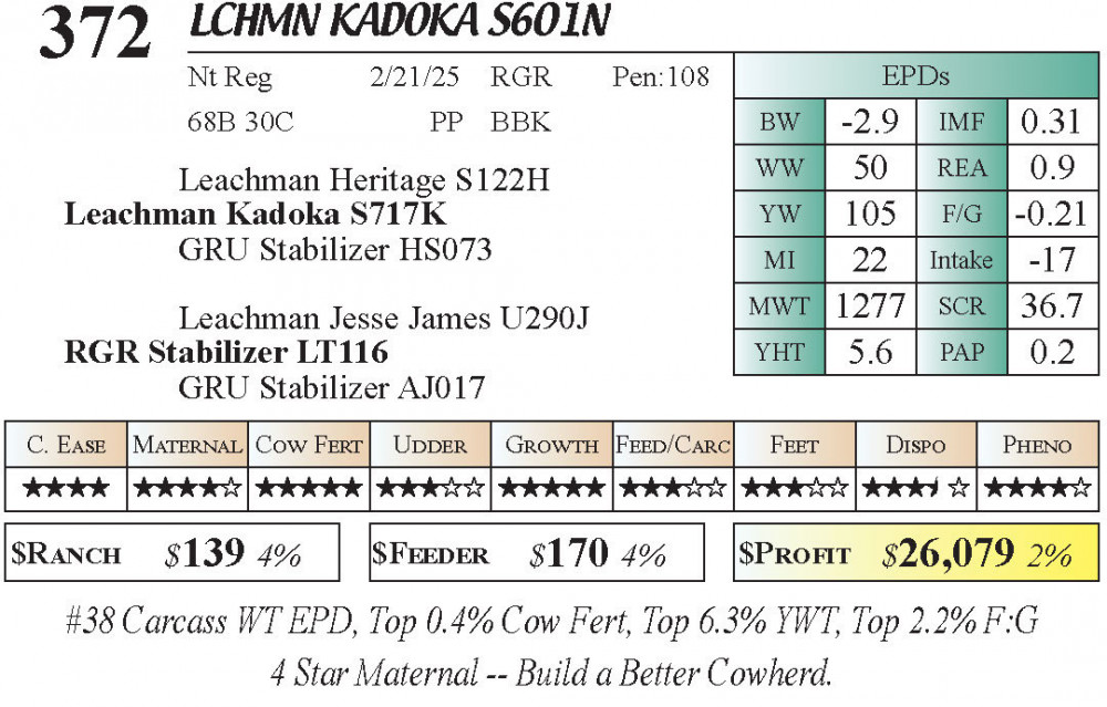 LCHMN Kadoka S601N (#372) 3.23.26 Leachman Cattle Spring Bull Sale 10:00 AM MTN 4 & 5 Star Calving Ease Bulls Bull - Stabilizer