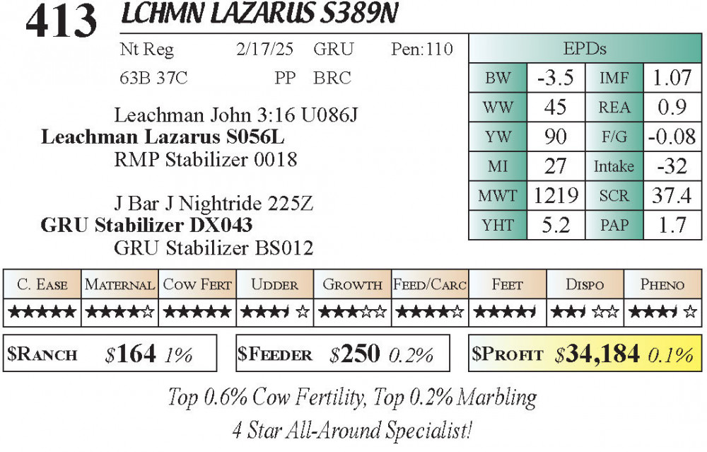 LCHMN Lazarus S389N (#413) 3.23.26 Leachman Cattle Spring Bull Sale 10:00 AM MTN 4 & 5 Star Calving Ease Bulls Bull - Stabilizer