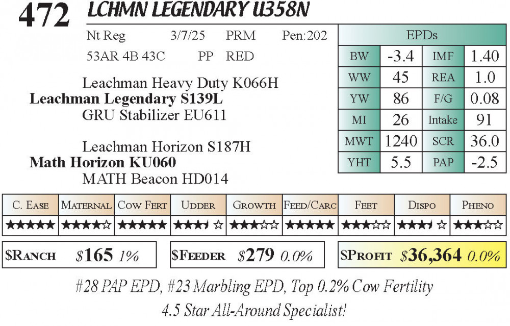 LCHMN Legendary U358N (#472) 3.23.26 Leachman Cattle Spring Bull Sale 10:00 AM MTN 4 & 5 Star Calving Ease Bulls Bull - Stabilizer Top 100 $Profit