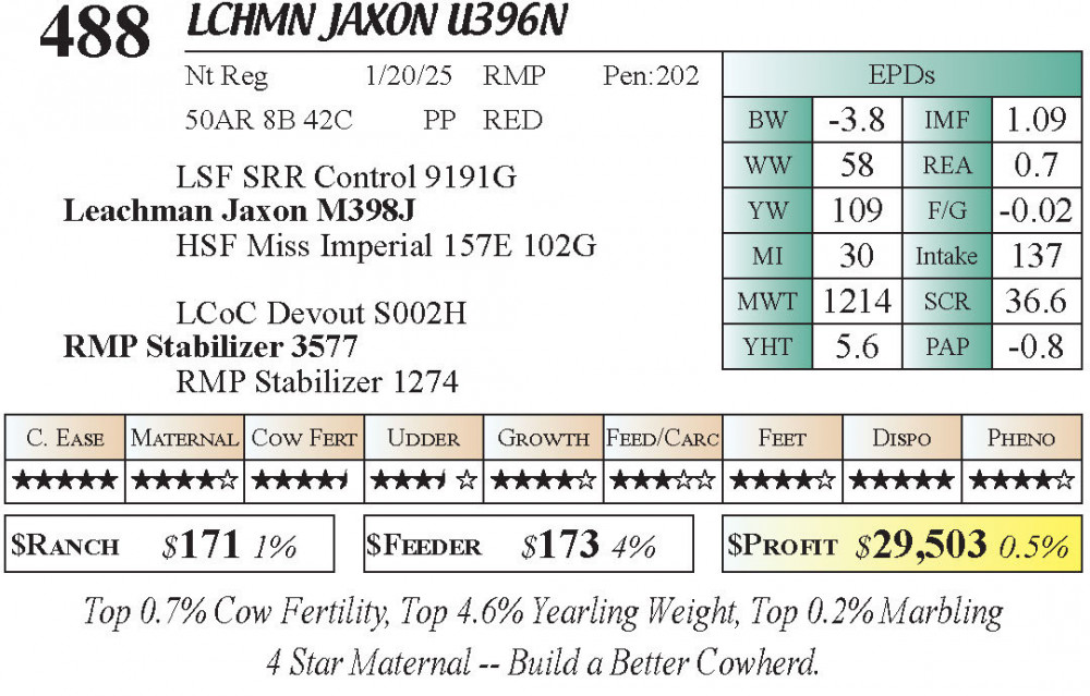 LCHMN Jaxon U396N (#488) 3.23.26 Leachman Cattle Spring Bull Sale 10:00 AM MTN 4 & 5 Star Calving Ease Bulls Bull - Stabilizer