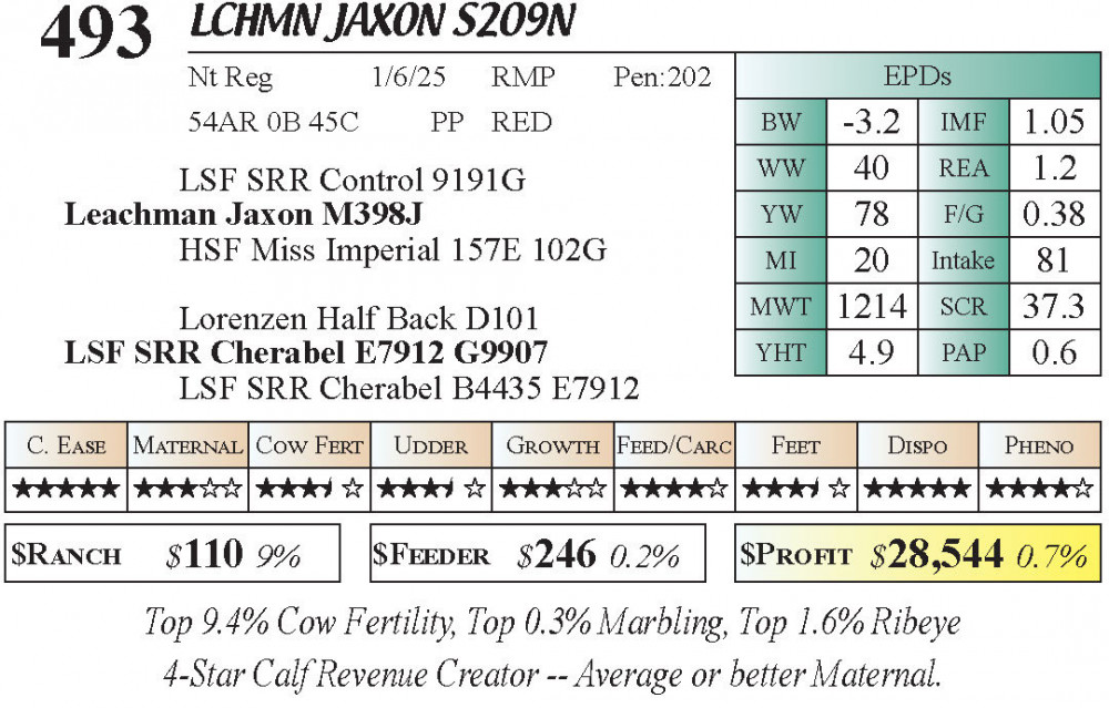 LCHMN Jaxon S209N (#493) 3.23.26 Leachman Cattle Spring Bull Sale 10:00 AM MTN 4 & 5 Star Calving Ease Bulls Bull - Stabilizer