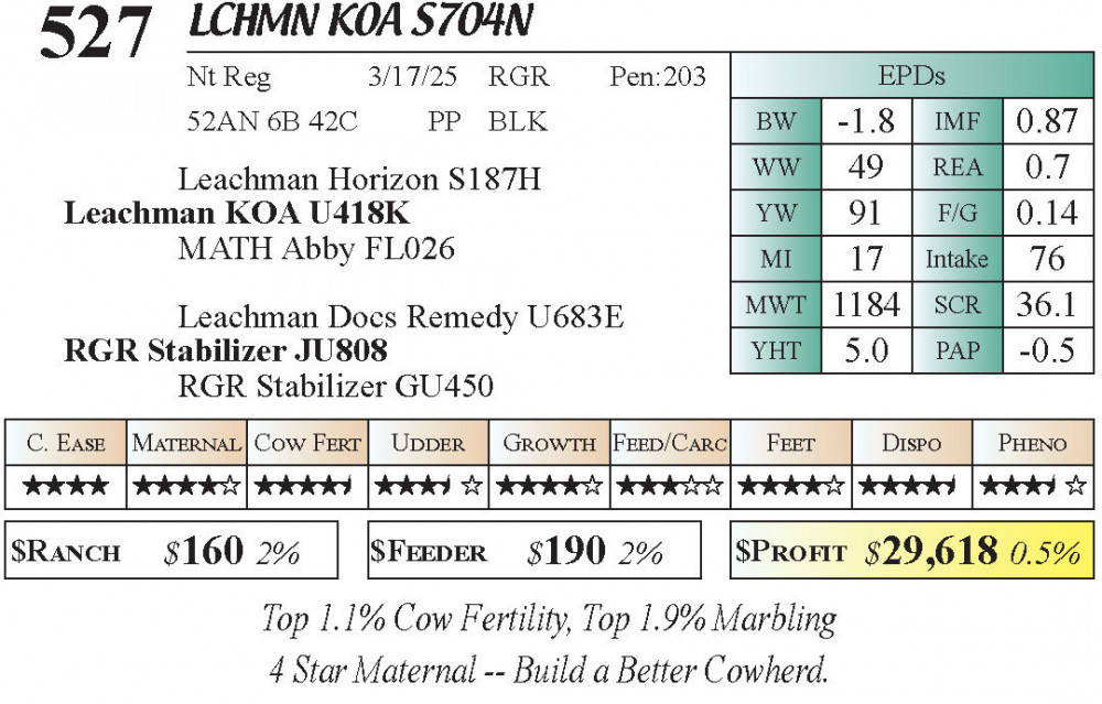LCHMN KOA S704N (#527) 3.23.26 Leachman Cattle Spring Bull Sale 10:00 AM MTN 4 & 5 Star Calving Ease Bulls Bull - Stabilizer