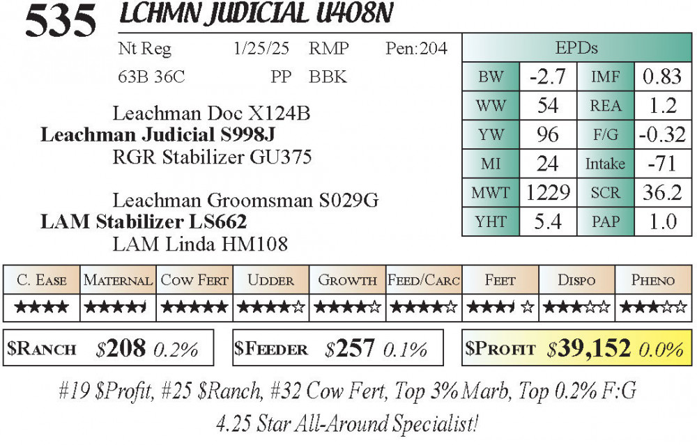 LCHMN Judicial U408N (#535) 3.23.26 Leachman Cattle Spring Bull Sale 10:00 AM MTN 4 & 5 Star Calving Ease Bulls Bull - Stabilizer Top 100 $Profit
