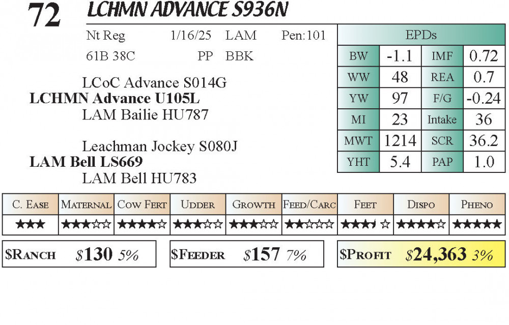 LCHMN Advance S936N (#72) Grass Time Private Treaty Online Bull Sale 3-5 Star Calving Ease PT Bulls - Stabilizer