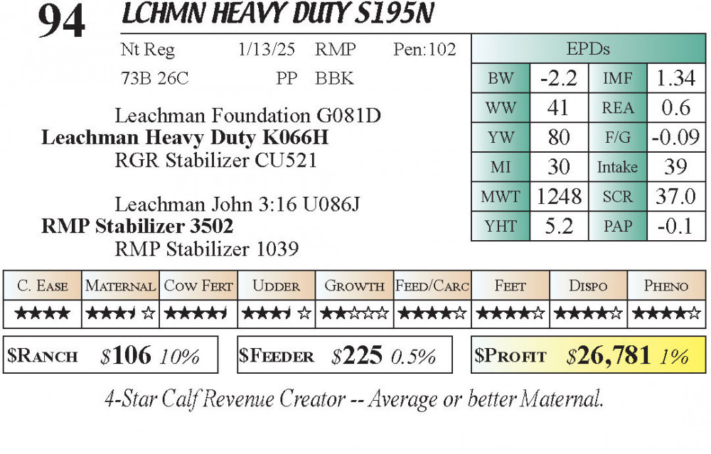 LCHMN Heavy Duty S195N (#94) Grass Time Private Treaty Online Bull Sale 3-5 Star Calving Ease PT Bulls - Stabilizer