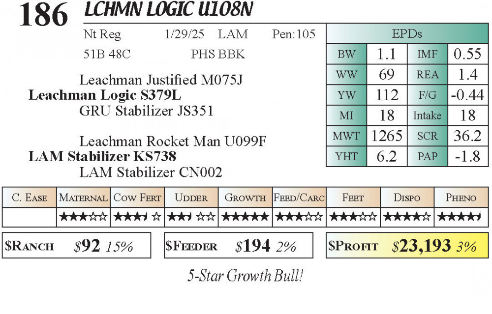 LCHMN Logic U108N (#186) Grass Time Private Treaty Online Bull Sale PT Bulls - Stabilizer