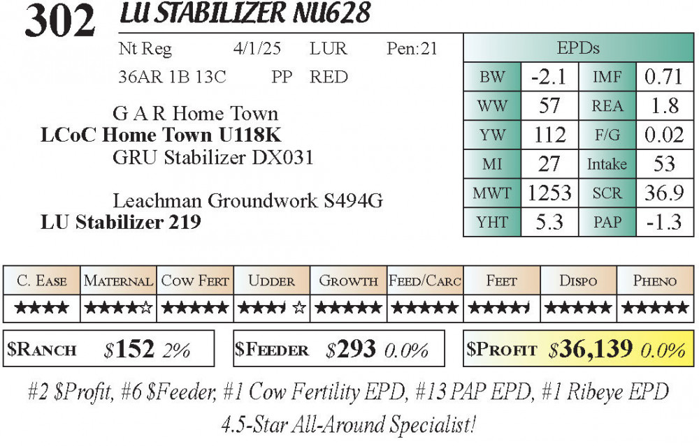 NU628 (#302) 5.2.26 Grass Time Bull & Female Sale 10:00 am MTN Stabilizer Female