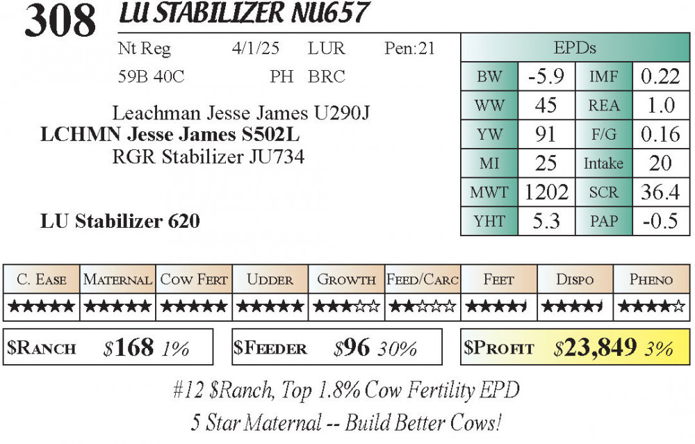 NU657 (#308) 5.2.26 Grass Time Bull & Female Sale 10:00 am MTN Stabilizer Female
