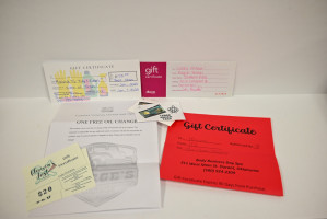 Adult Large Lion Pride Red Crewneck Sweatshirt, Baby It's Cold Outside Tumbler (donated by Ashley's Creations), White Crewneck FFA Sweatshirt, Adult Small Green Country Chick T-shirt, Adult Large White T-Shirt with 3 gnomes, FFA Pen, FFA Keychain, FFA Badge Holder, $40 Gift Certificate Glenna's Just Baked Goods, $100 Basic Clean Gift Certificate from Momma T's Tidy & Clean, Gift Certificate from Kaylyn French @ Southern Roots, 2 Free Indian Tacos certificates from Fry Bread Express, 1 free Oil Change from Sarge's Garage, The Works Massage Gift Certificate from Body Business Day Spa, and large brown harvest blessings canvas basket.