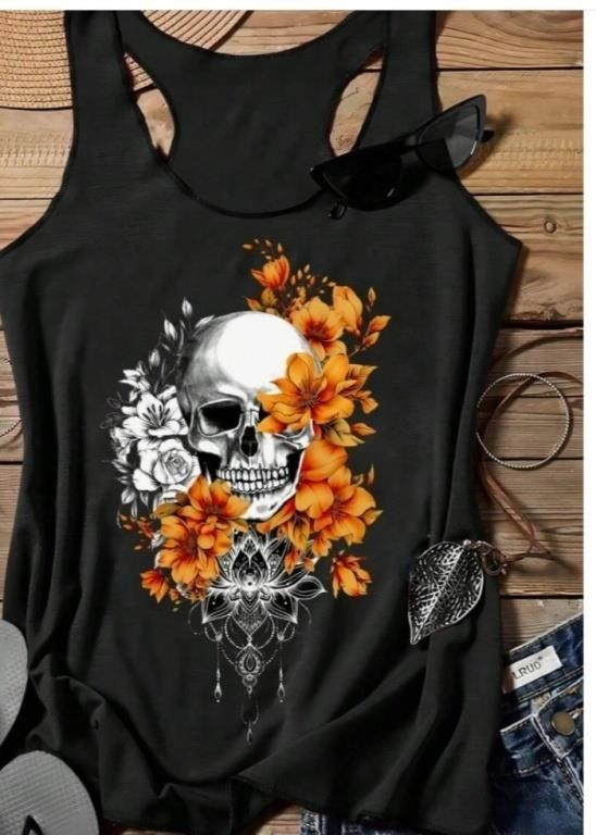Women's Casual Skull & Floral Pattern Tank Top XL Great Deals and Steal