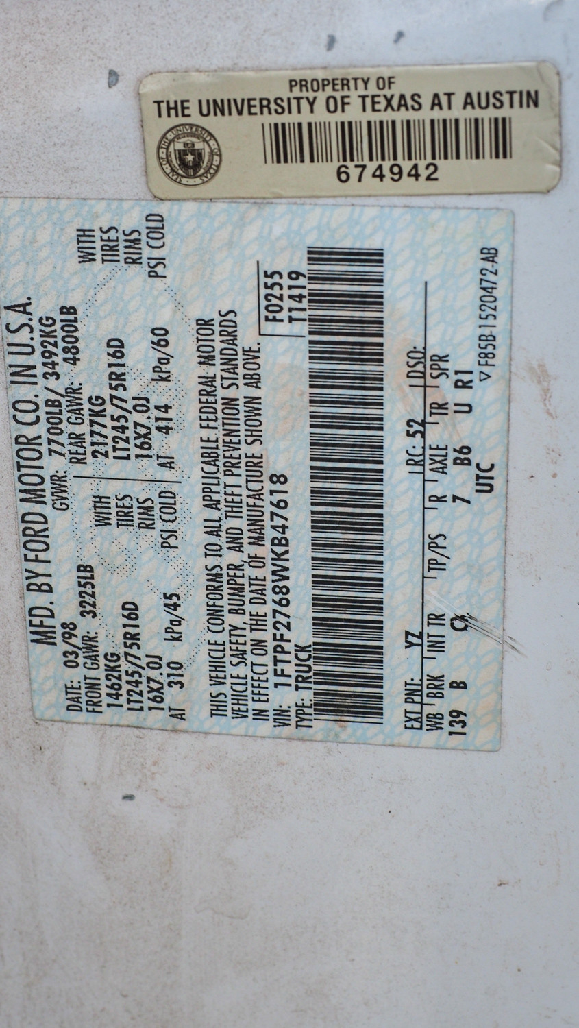 1998 Ford F-250, VIN: 1FTPF2768WKB47618, OD: 75986 (#452753) University Of Texas At Austin