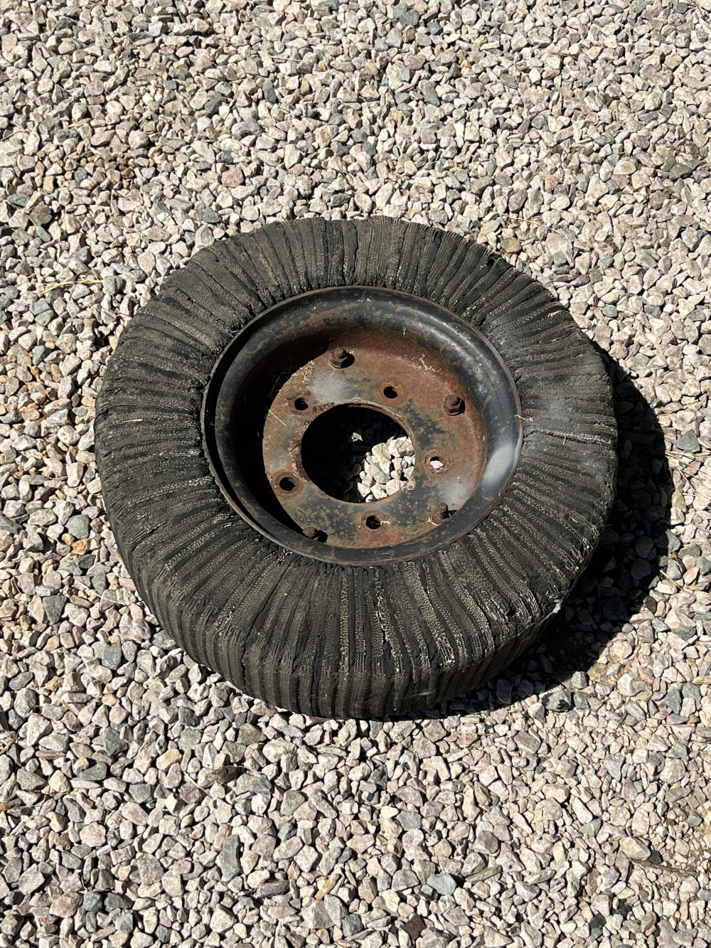 Tail wheel for shredder. Wheel measures 18 inches x 5 inches. Center hole is 4 inch, has a 5 bolt pattern that is 3 1/4 inch from hole to hole