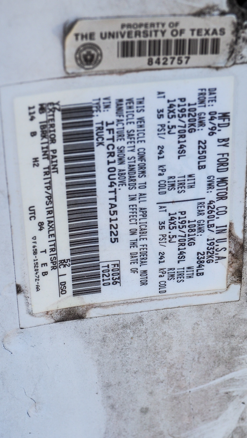 1996 Ford Ranger XL, VIN: 1FTCR10U4TTA51225, OD: 061962 (#452803) University Of Texas At Austin
