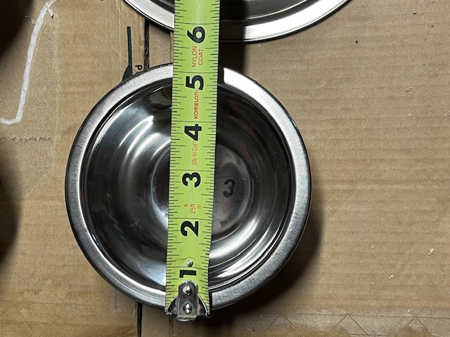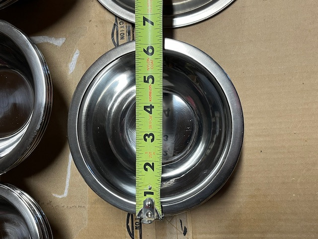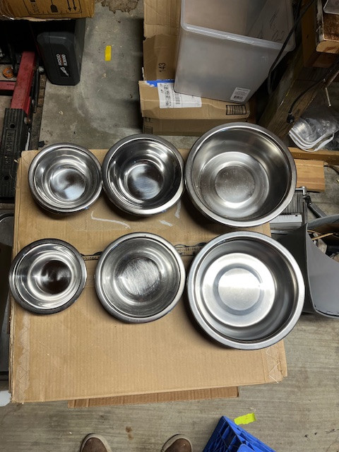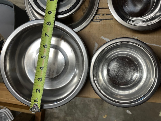 Lot of 19 small stainless steel bowls. Great for dogs and cats. 5 of the 5" bowls and 7 each of the 6" & 8" bowls.