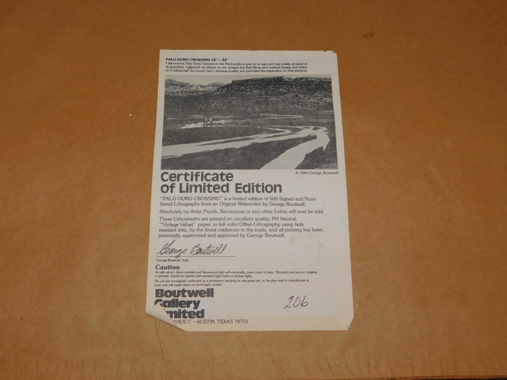 "Palo Duro Crossing" Lithograph by George Boutwell. #206/500 limited edition. Slight wear to frame, glass is clear. . 34"x24"