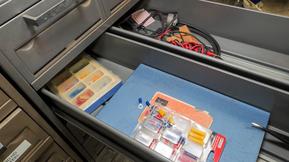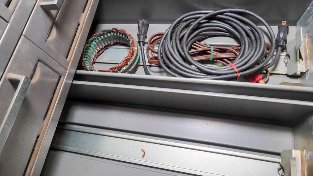 10 drawer cabinet includes wire termination ends, electrical wire, alligator clamps, test wires, plug timers, extension cords, and more.
