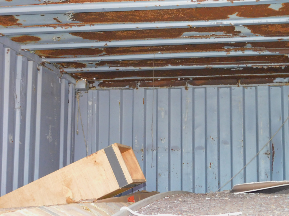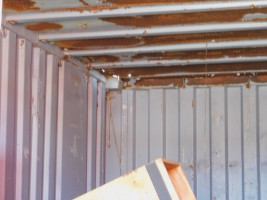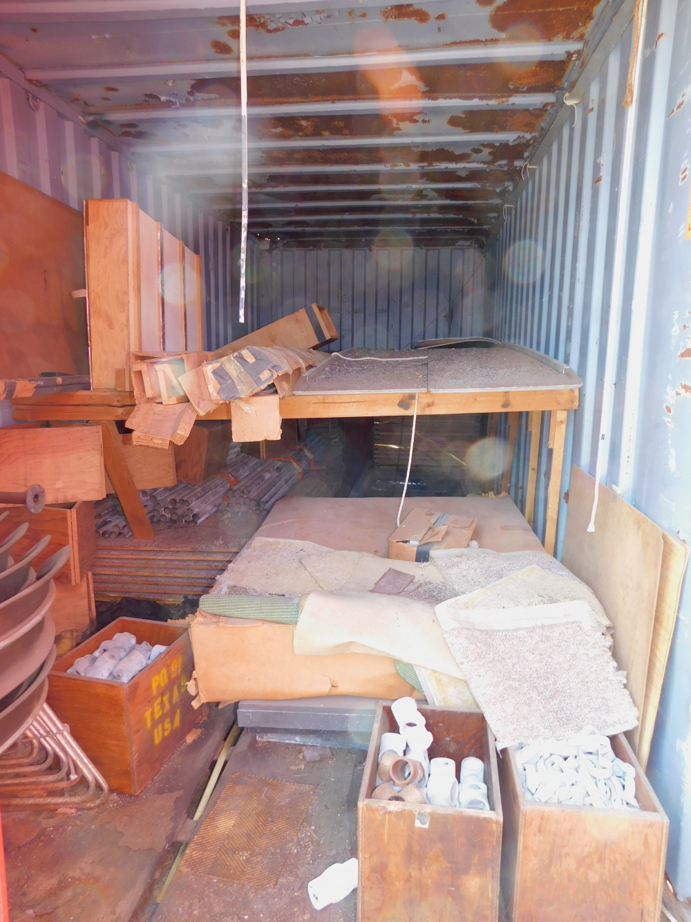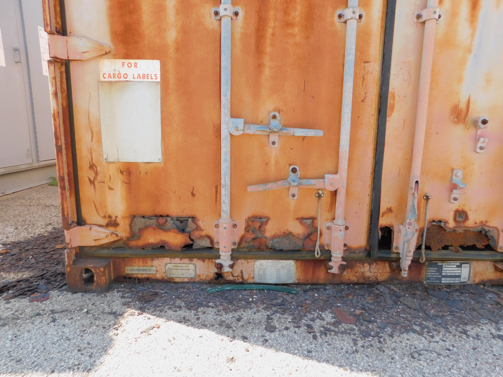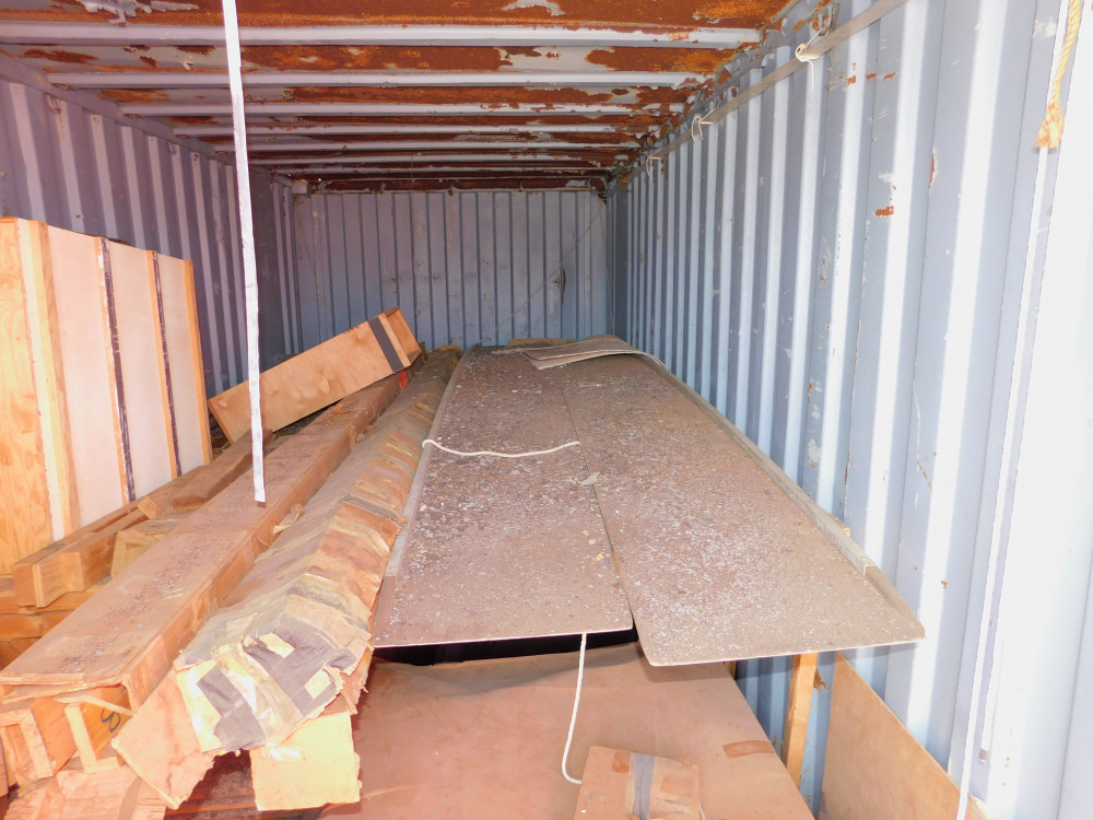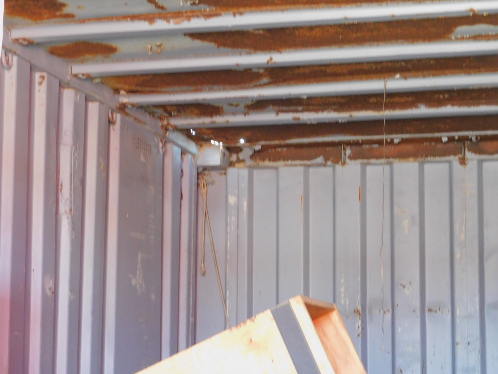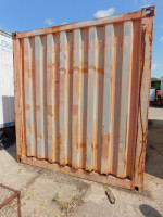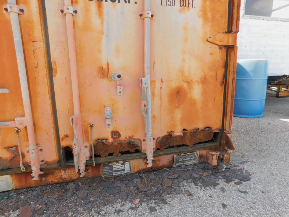 Shipping Container, 8ft by 20ft. Heavy rust, interior load floor damaged, water leaks, contents included such as loading ramps.