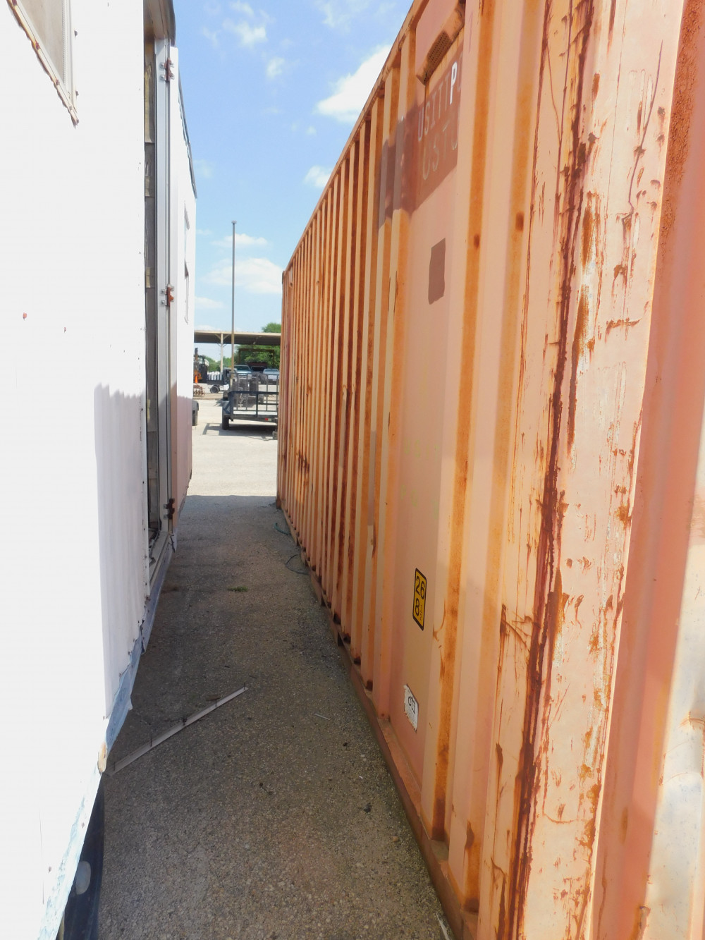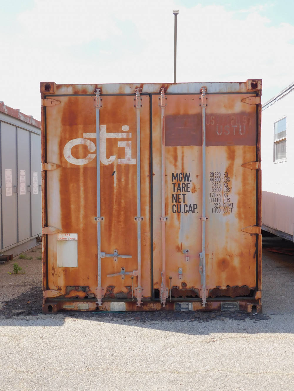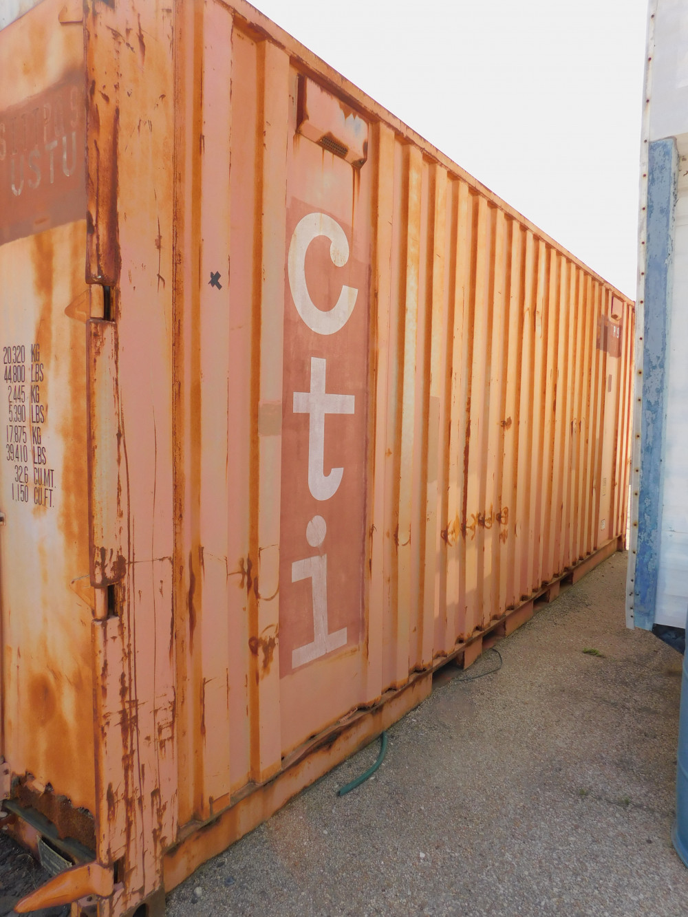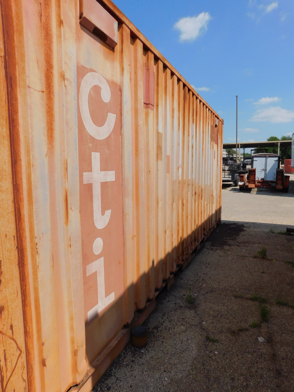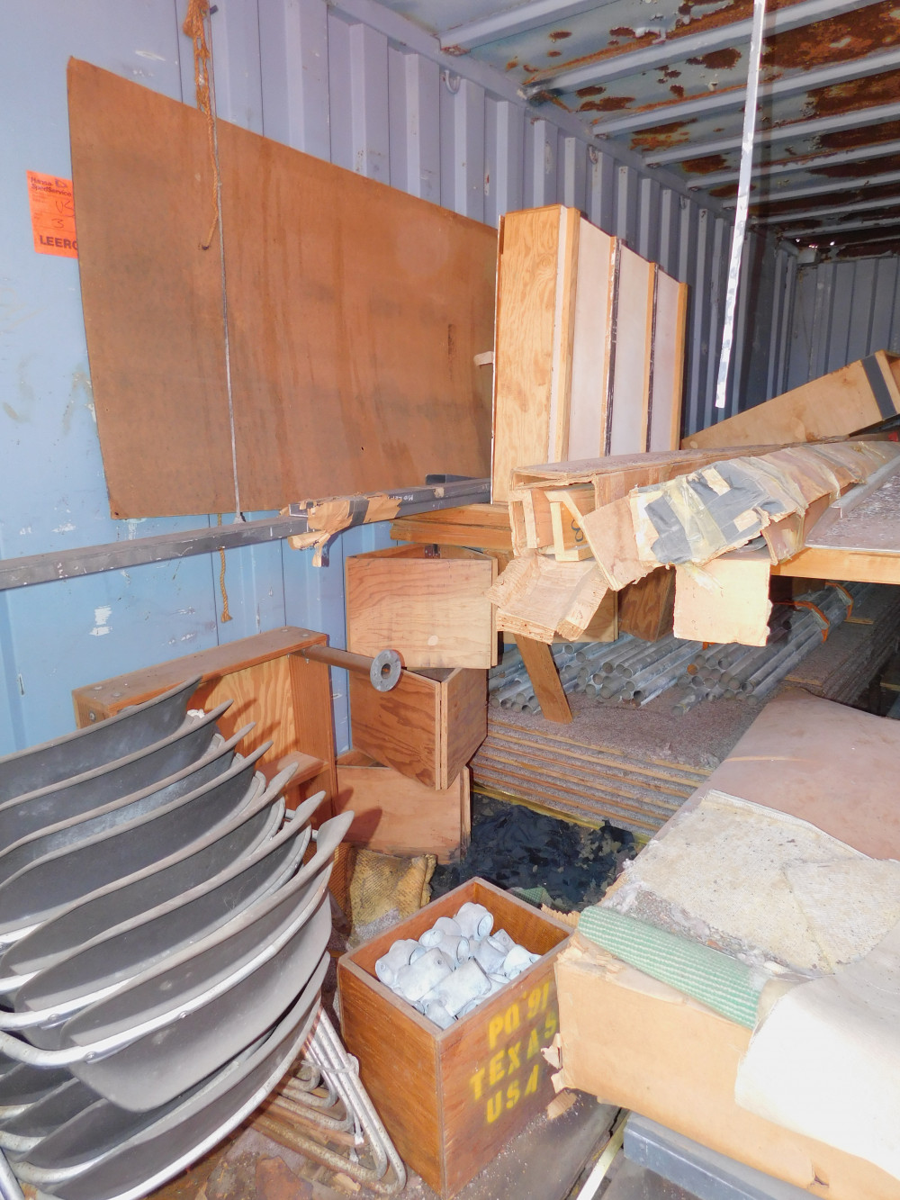 Shipping Container, 8ft by 20ft. Heavy rust, interior load floor damaged, water leaks, contents included such as loading ramps.