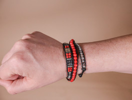Enjoy a unique handmade beaded wrap bracelet with metal and rope accents. This bracelet has a mixture of red and gray beads to accent your outfit!