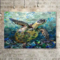 Sea Turtle & Plastic Waste Canvas Art - Modern Frameless Wall Decor 8x12 Bin 11 **