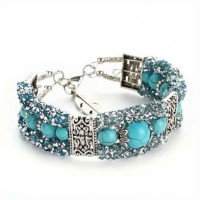 Qty of 2 Vintage Faux Turquoise Beads Rhinestone Carved Bracelet Bangle Jewelry ***