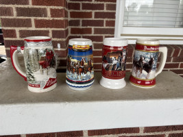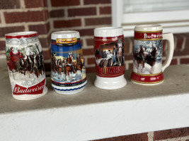 Budweiser Beer Holiday Christmas Stein Mug Clydesdales by Ceramarte Snowy Bridge -4 total with a 2024 Calendar. The collective mug years are 2002, 2019. 2016, and 2022.