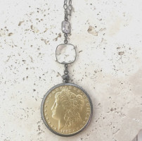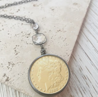 This necklace is simple and eye catching. It features mixed metals. The American Morgan coin replica is dipped in gold. Gunmetal chain 32".