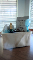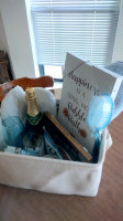 1/3 Just for the lady gift basket- Blue bath towel, "Happiness Is A Long, Hot Bubble Bath" wall hanging, back scrubber, memory foam slippers size medium 7-8, Welch's sparkling white grape juice, blue wine glass, body wash, bath bombs, loofah, dove chocolate, "Break in case of emergency" wall hanging, blue soy