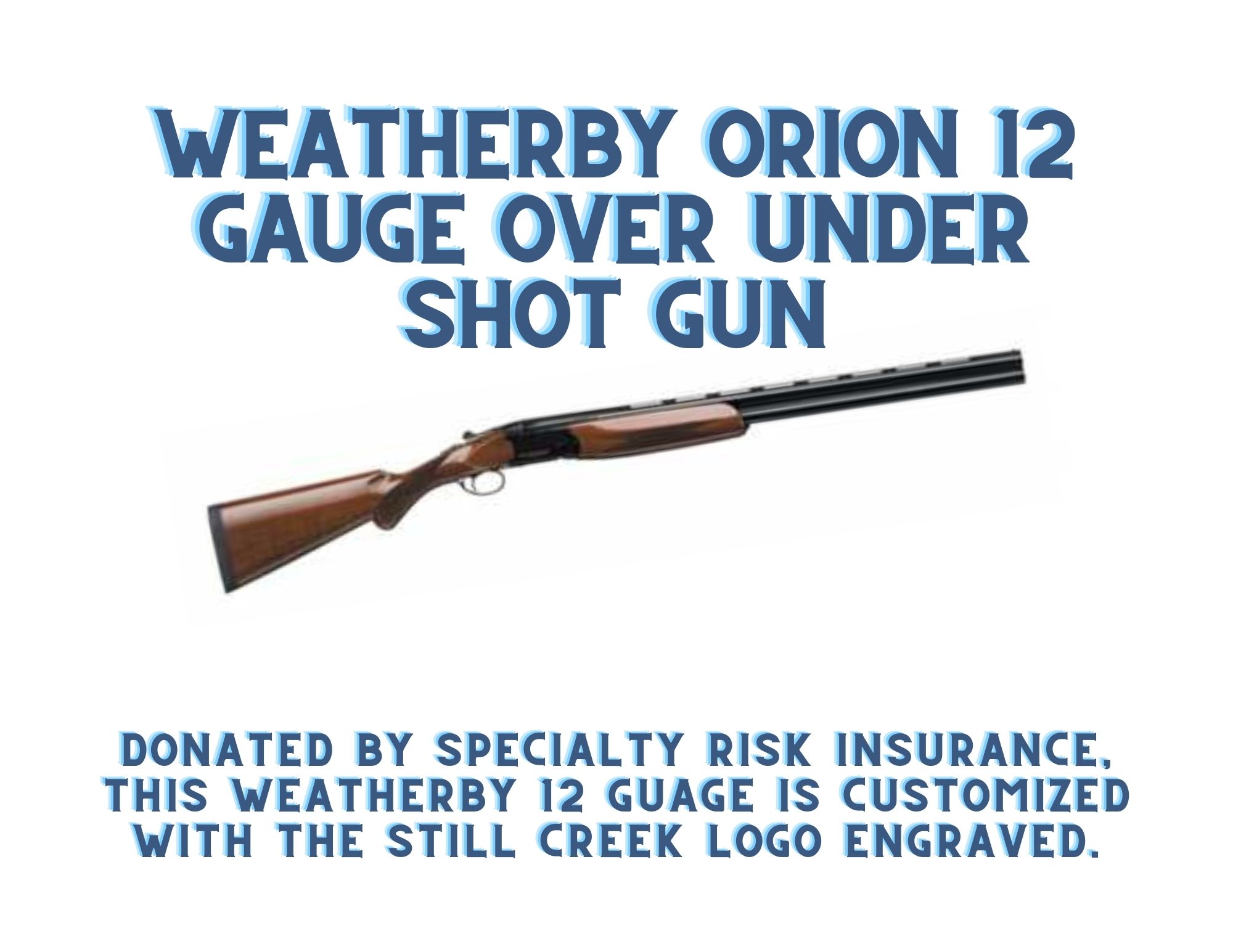 We are excited to offer a lucky donor a one of a kind engraved Still Creek over under shotgun. Weather by Orion 12 gauged 3 in Blued Over Under Shotgun.