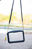 Clear Michael Kors Crossbody with Navy Blue Monogram Print Outline.