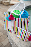 Head to the beach with this adorable Mud Pie Jute Tote with matching pouch and two beach towels.