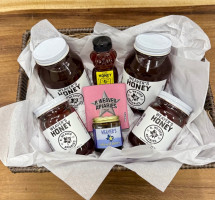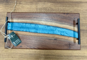 Walnut and Turqoise Epoxy Serving Tray/ Charcuterie Board and basket of honey includes 2 large, 2 medium, 1 small honey jars, a honey bear, and koozie.