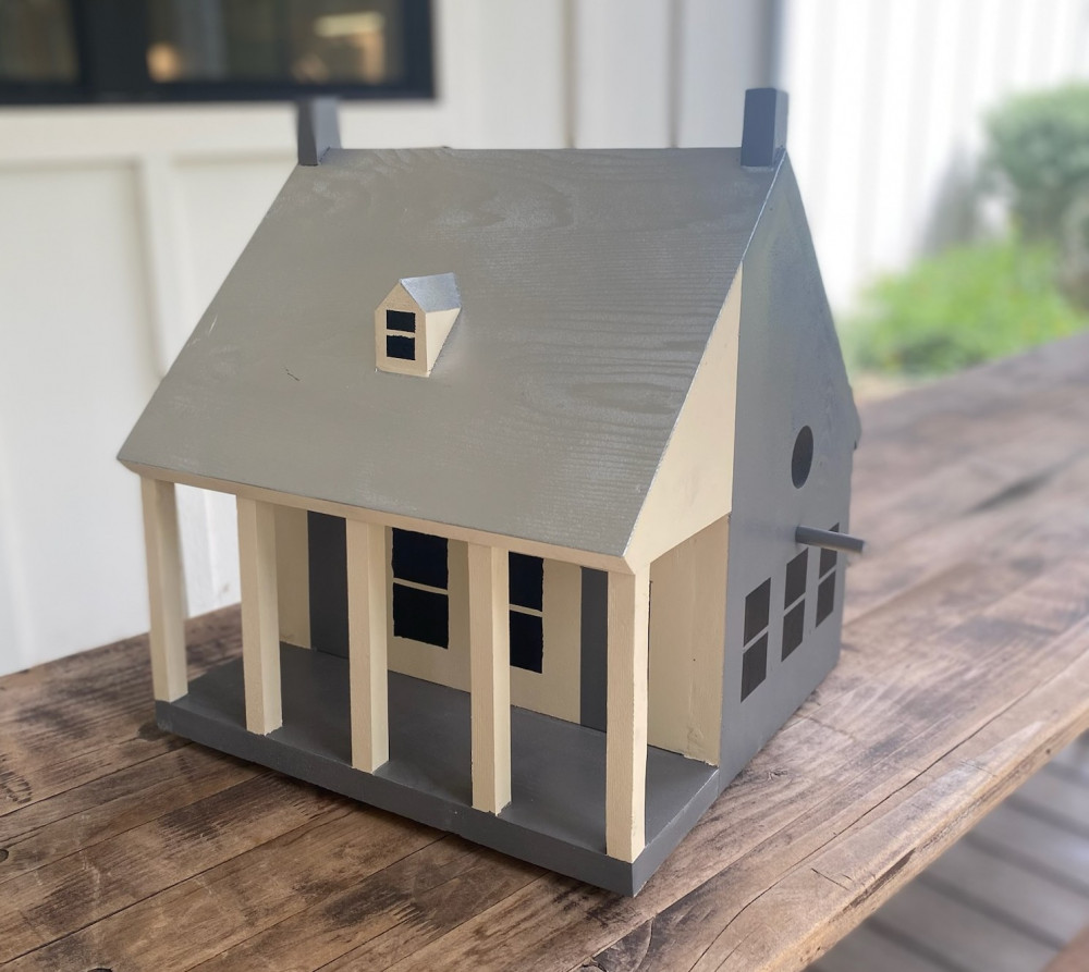 Rummel House Birdhouse-This handmade replica birdhouse pays tribute to our beloved Rummel Haus. Lovingly reproduced in miniature detail, this piece captures the architectural charm and warm community spirit of this historic building. Whether you're a birding enthusiast or a Round Top regular, this replica will make a perfect addition to your garden or will serve as a decorative keepsake. Details:Two-hole, double occupancy, opens for easy cleaning, Made of cedar Size: 12” L x 12” W x 12” H