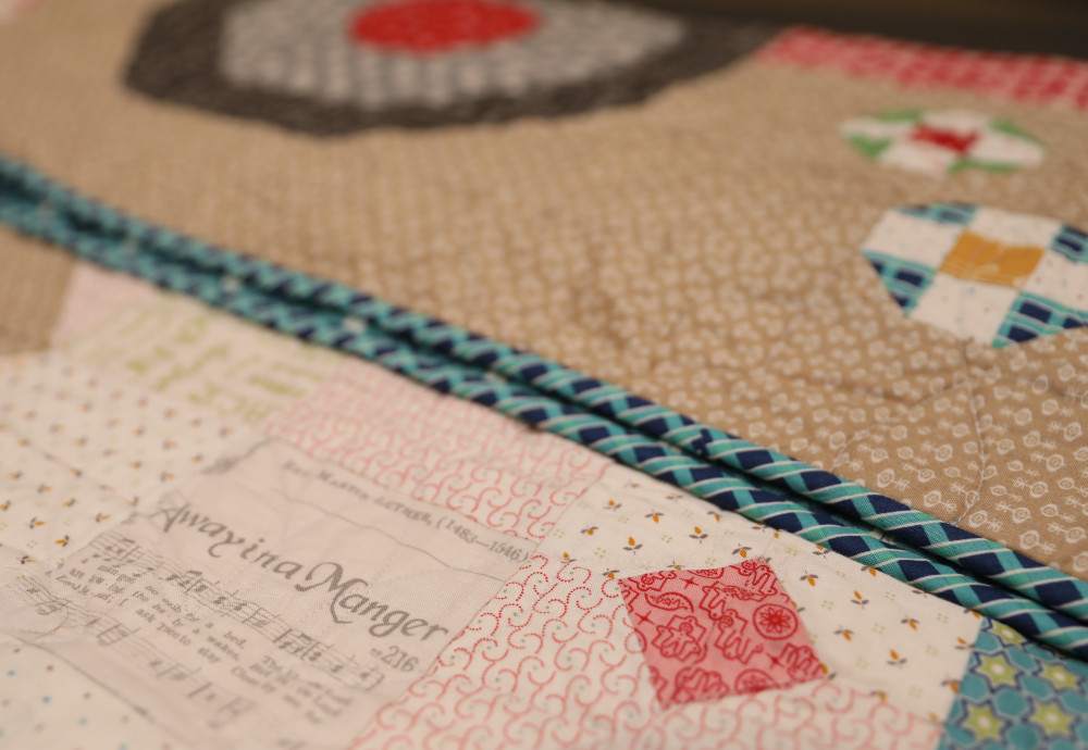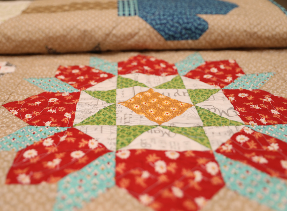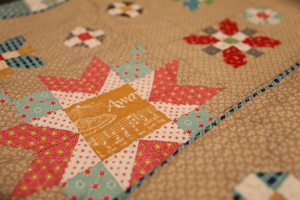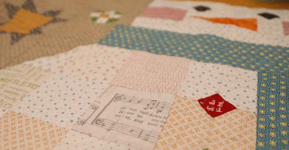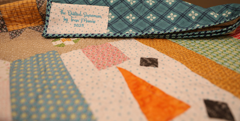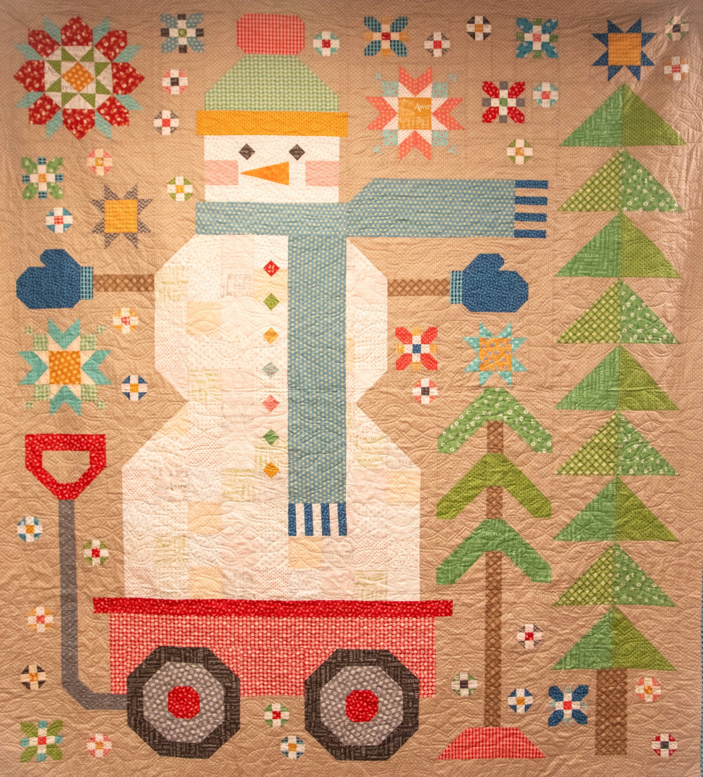 "The Quilted Snowman" handmade quilt is an heirloom piece capturing the spirit of winter and crafted by Fran Maness. 1,028 pieces of designer Lori Holt's "Home Town Holiday" fabric collection. Measures 7' x 8'.