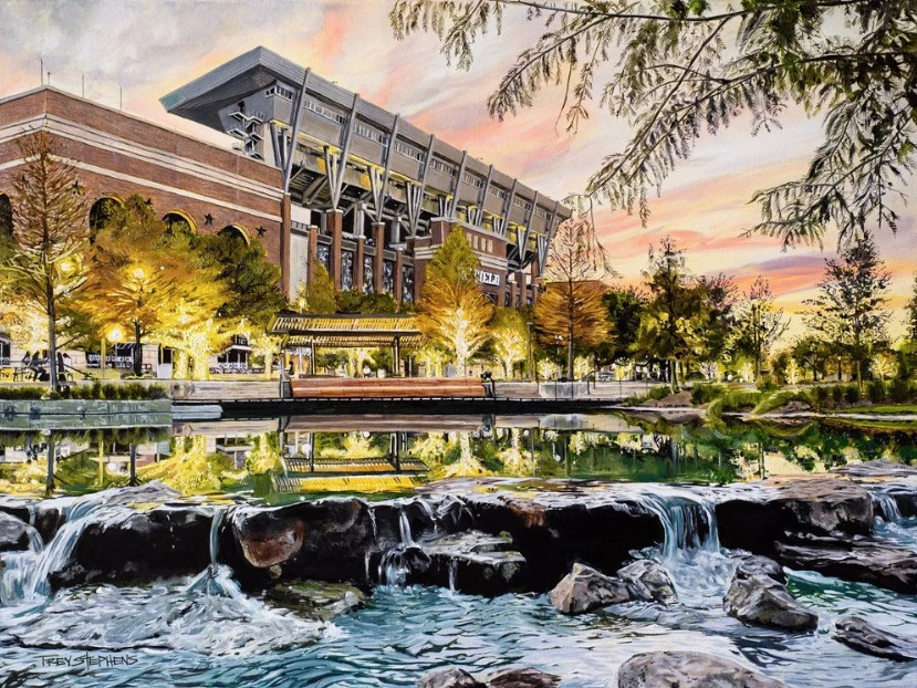 24x18” Canvas print of Trey Stephens’ original oil painting of Aggie Park! Giclée print on 3/4” deep Stretched mount gloss canvas. Black Archival Backing & Wire Hanger with black sides.