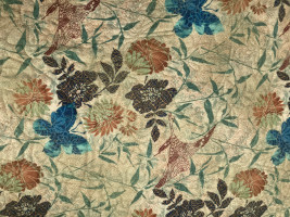 Asian-inspired 80” x 80” handmade quilt. The colors are navy, teal, rust & beige fabrics with a golden sheen. The design is a butterfly & fan quiltIng pattern. The backside was also pieced. Created by CASA Advocate Brenda Walters.