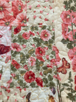 Hollyhocks & butterflies 80” x 80” handmade quilt. Shades of corals, pinks, yellows & green. The pattern is a beautiful butterfly & flower quilting design. Created by CASA Advocate Brenda Walters.