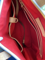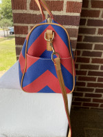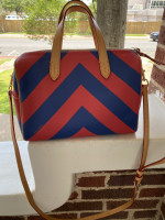 This Dooney & Bourke satchel purse comes in a vibrant red & blue chevron print. It has a spacious red interior with plenty of pockets for a phone and wallet. The long strap can also be detached. Has been authenticated by the donor. Does not include registration certificate or store tags.