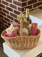 This basket includes one bottle of wine, one green tea hand lotion, a necklace, and a picture frame. Cute, 'girly" basket!