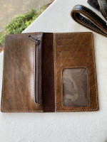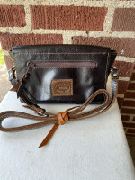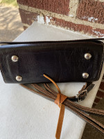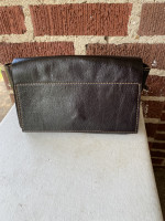 Black crossbody purse made from genuine leather, silver hardware, adjustable straps & a matching leather wallet.