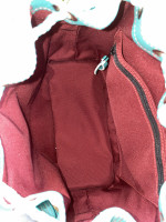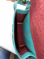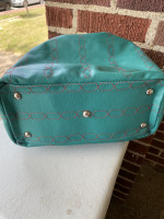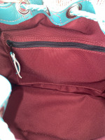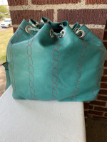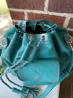 Teal drawstring bag & leather keychain. This purse has a front pocket perfect for a cell phone. The inside of the purse is very spacious with a zipper pocket.