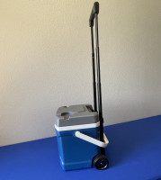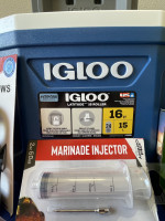 BBQ cooking setup. Igloo 16 Quart Roller Cooler, Marinade, Marinade Injector, Meat Claws, Light Up Koozie, and Table Cloth
