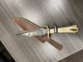 Camel bone handled knife with a 8.5 inch Damascus steel blade includes leather sheath