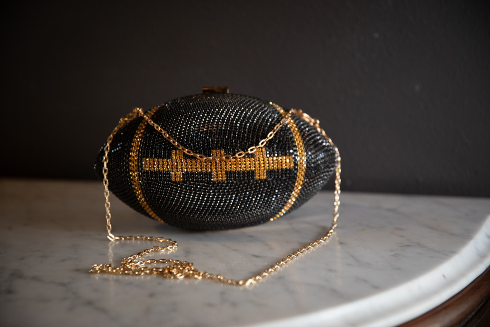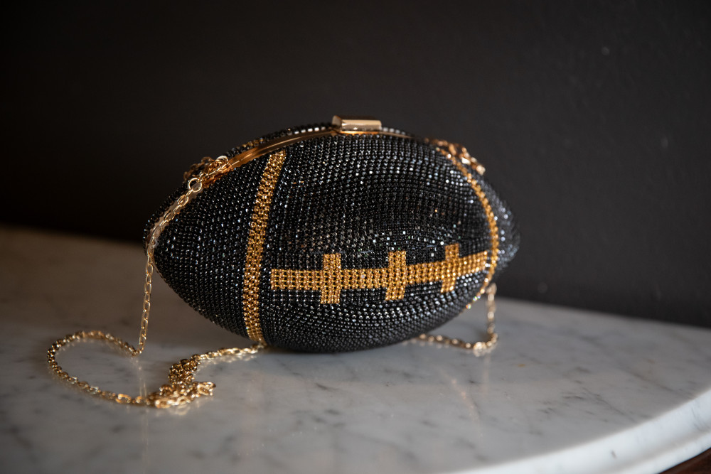 Black & Gold Rhinestone Football Purse - Clasp Closure & 2 Gold Chain Straps - 12" W x 6.5" H
