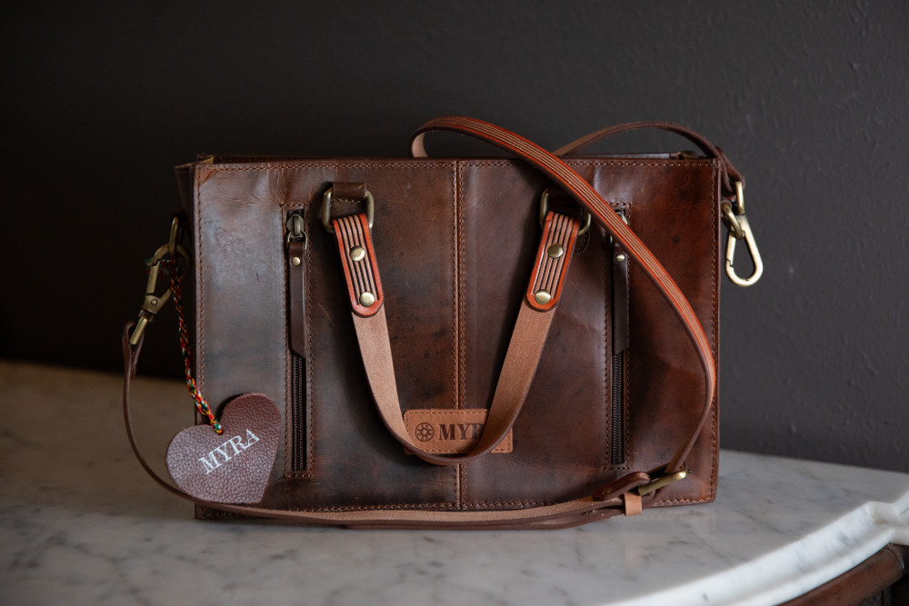 Myra Hand Tooled Leather Canceled Carry Purse - 11.75" W x 8 " H - Detachable Leather Strap, Two Handle, One Interior Zipper Pocket, 2 Interior Cell Phone Pockets - 2 Exterior Conceal Carry Pockets