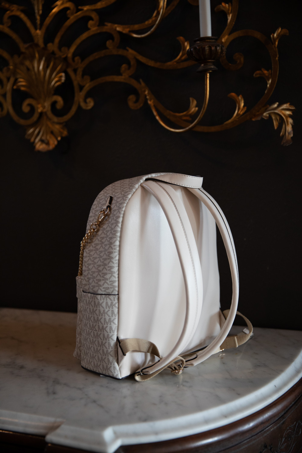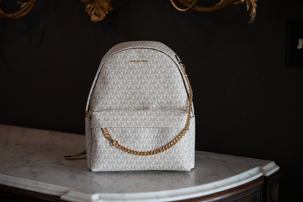 Michael Kors Slater Light Creme Logo Backpack - Adjustable Backpack Straps, Removable Purse Chain Strap - Zip Top Closure, One Exterior Pocket - 12"W x 12.5"H