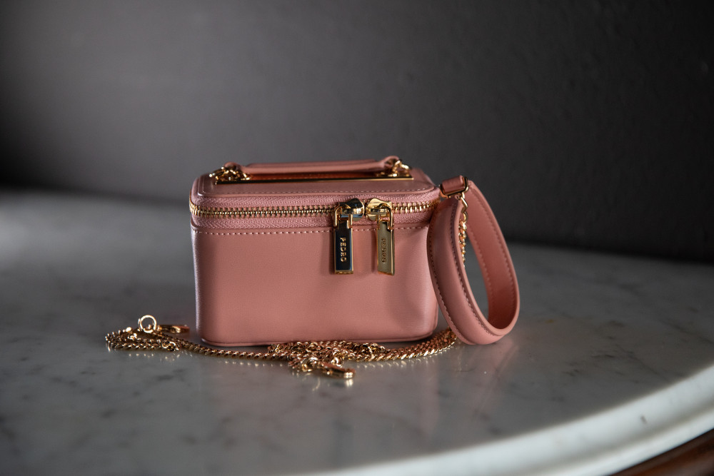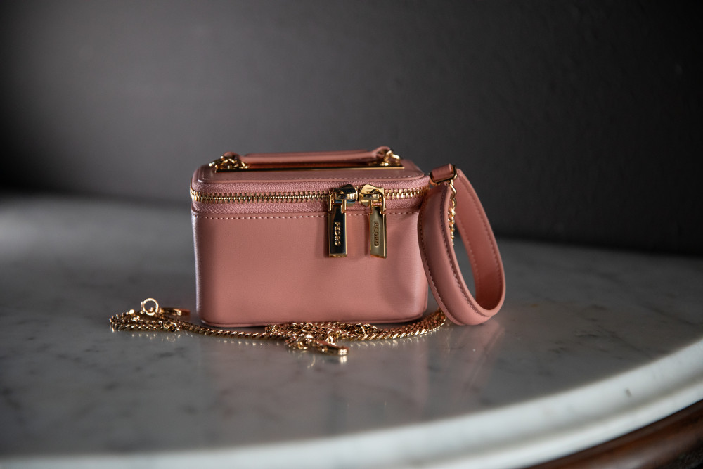 Pedro Ari Leather Mini Vanity Case Blush - Removable Shoulder Strap, Interior Drawstring Closure, Dust Bag - 5"W x 3"H