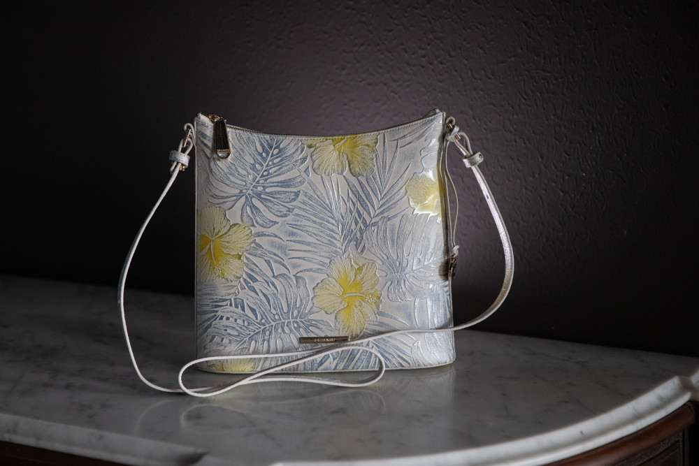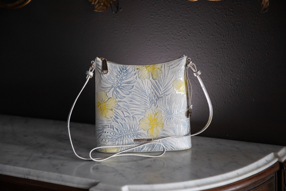 Brahmin Katie Lemonade Nostalgia Cream with Light Blue - Crossbody Shoulder Strap, One Exterior Magnetic Close Pocket, Zip Top Closure, One Interior Zipper Pocket, One Interior Cell Phone Pocket, Dust Bag - 11"W x 10"H