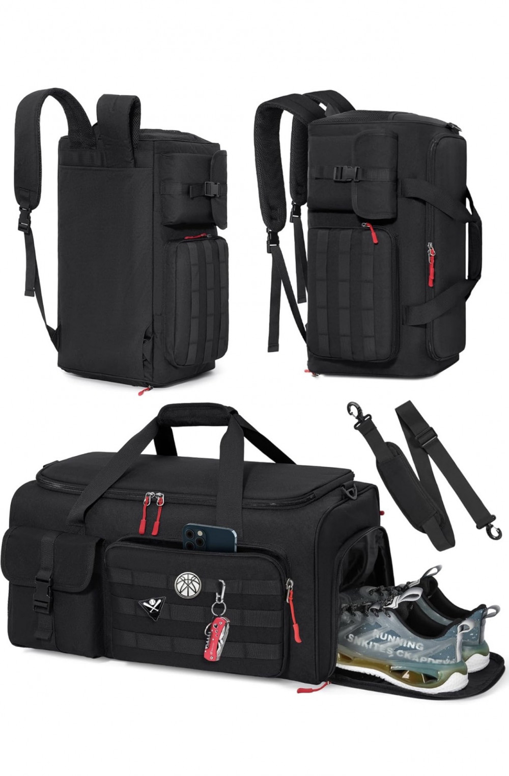Large Black Gym Bag - Two Handles, Backpack Straps, Adjustable Shoulder Strap, Zip Top Flap Closure, Interior Velcro Laptop Sleeve, Two Interior Pockets, Two Exterior Pocket, Shoe Pocket.